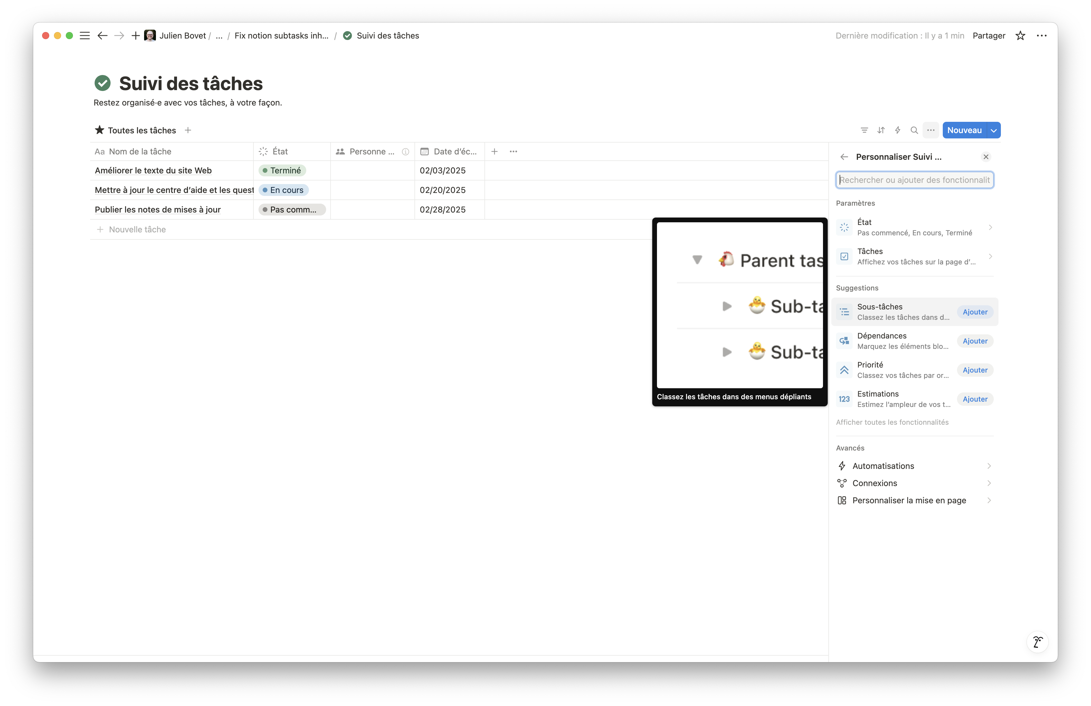 …Mais elle ne dispose pas d’une propagation automatique des valeurs de la tâche parente. Pour mettre en place des sous-tâches dans une base de tâches, il suffit d’aller dans Options de la base → Personnaliser → Sous-tâches. Si vous souhaitez le faire comme les pros, il s’agit simplement d’une relation de la base à la base elle-même, avec une colonne tâche parente, une colonne sous-tâche.